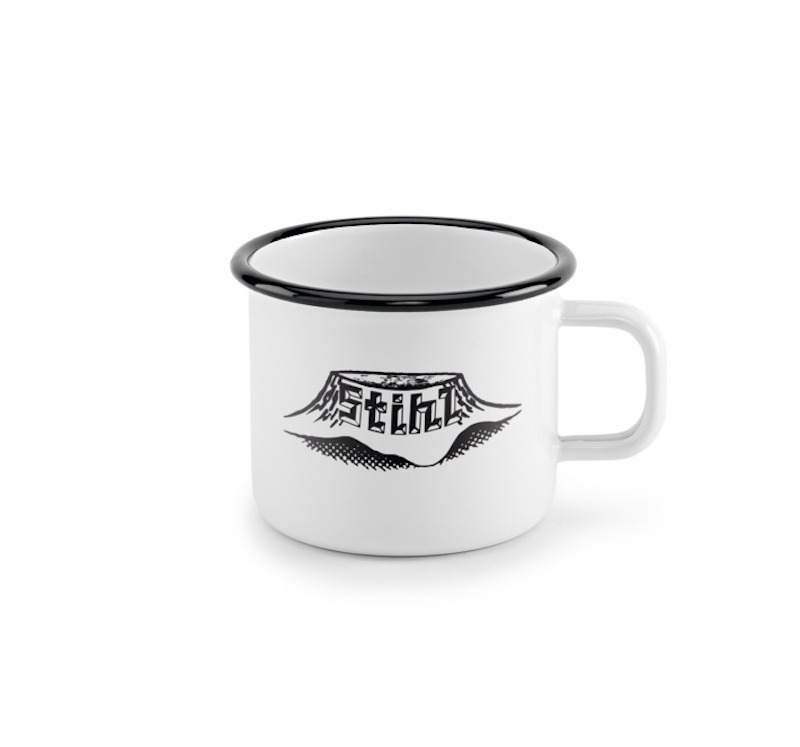 Populární smaltovaný hrnek na nápoje, v bílém provedení, s černým okrajem, historické logo STIHL, rozměry: průměr cca 10 cm, výška cca 9 cm.